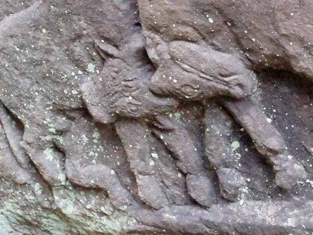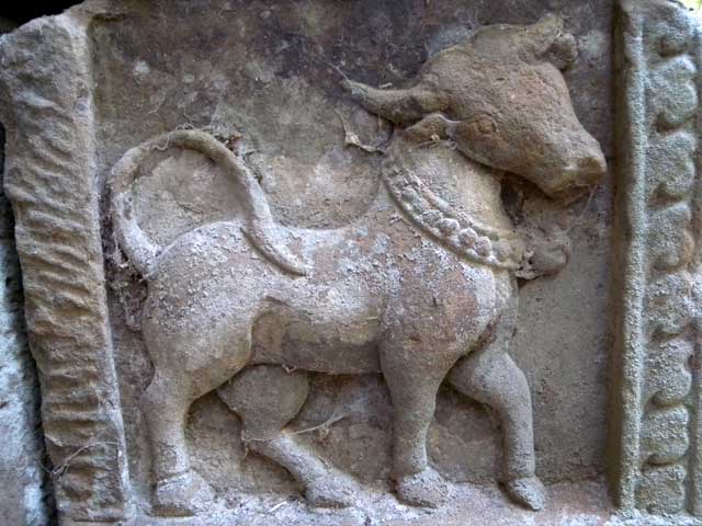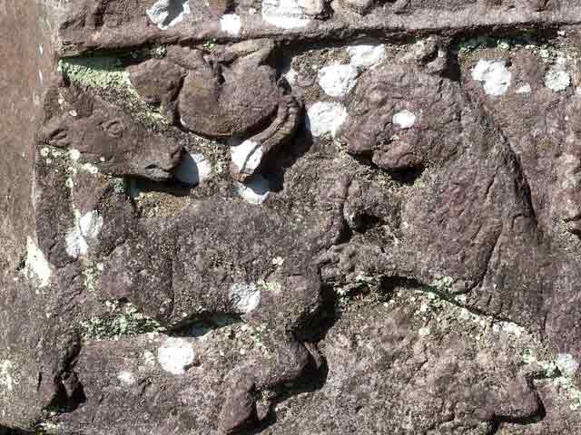 塔門の壁面は、30cmほどの小さい区画に区切られています。そこに牛や猪などの動物や物語が刻まれています。物語は、下から上へ展開しています。