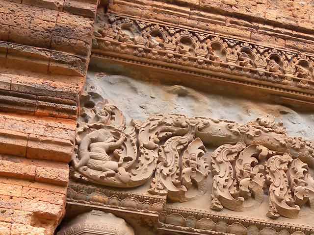 四方に階段が一つづつあるラテライト造り三層の基壇上に、一基のレンガ造りの主祠堂が建っています。