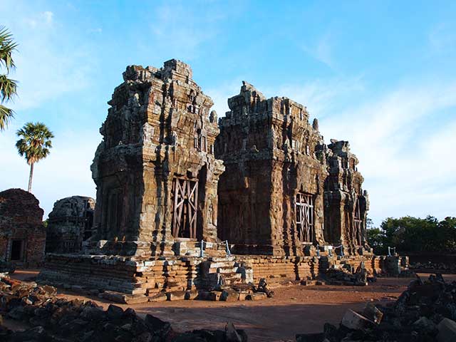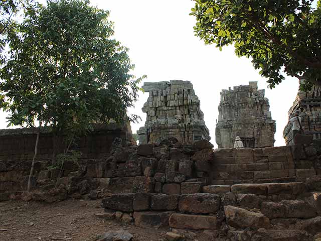 40m四方のラテライト周壁内の中央に砂岩の祠堂が、基壇上に三つ、中央祠堂が4mx4m、他の2基は3.4mx3.4mで南北方向に並んでいます。正面は、東でです。