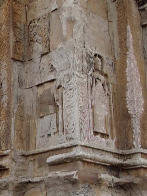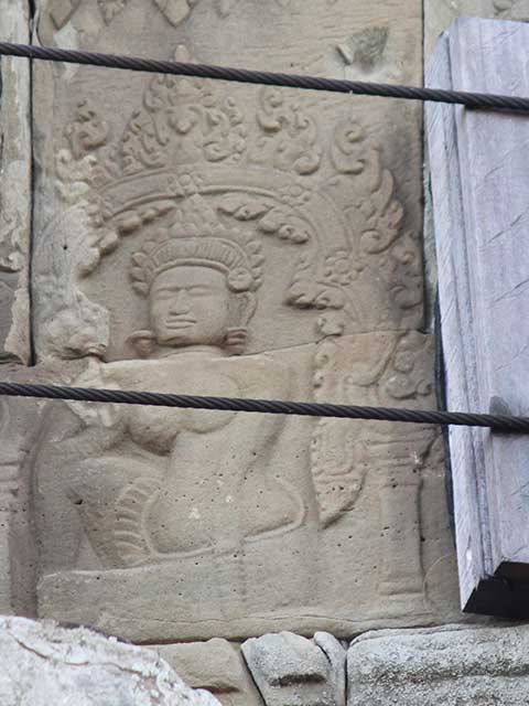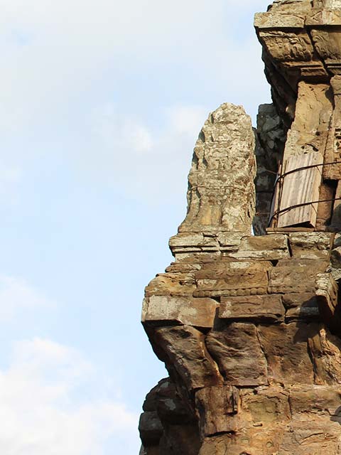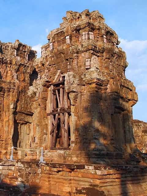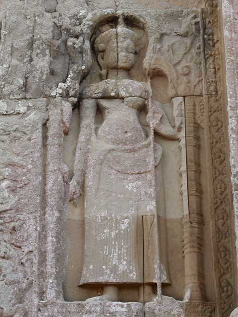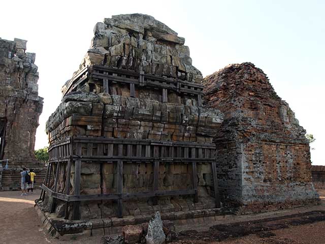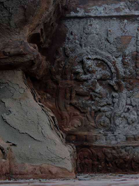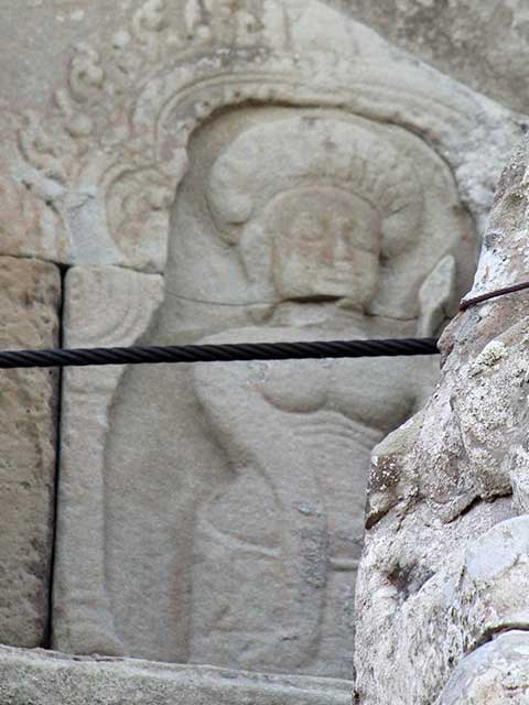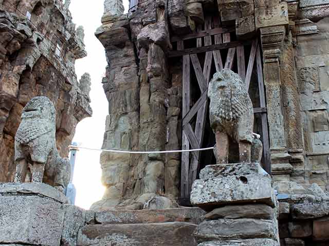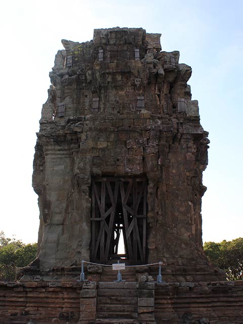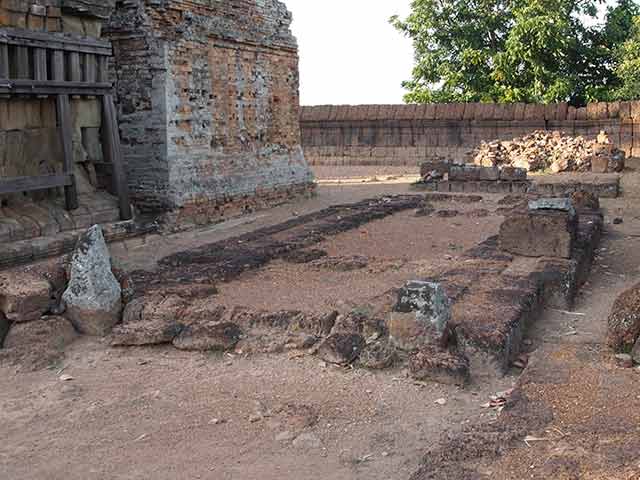更に、周壁上の東西南北には、ポーチ付き十字形塔門が置かれています。また、周壁に沿って10基のラテライト造りの細長い建物の基礎が残されていいます。