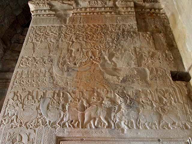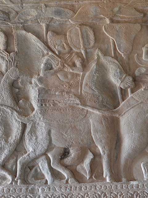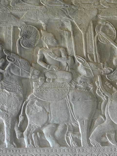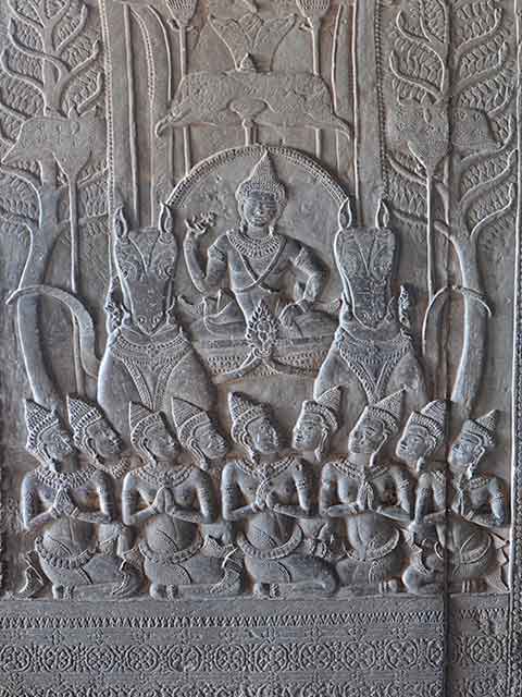 アンコール・ワット第一回廊の北西隅塔東側北面、馬に乗るスーリヤとチャンドラが描かれている壁面の上部に、横並びに8体の神々が描かれています。