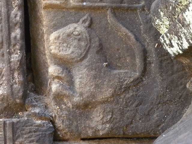 塔門の壁面は、30cmほどの小さい区画に区切られています。そこに牛や猪などの動物や物語が刻まれています。物語は、下から上へ展開しています。