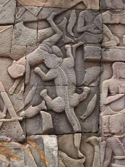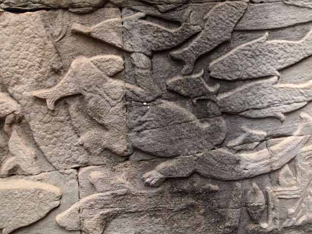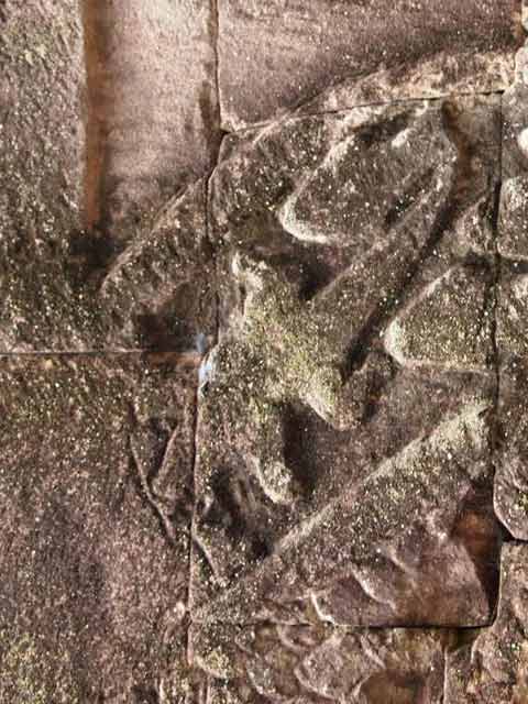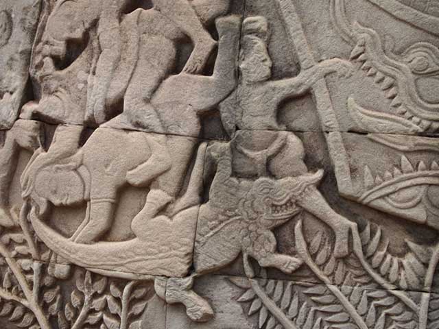 外回廊の壁面には、火をおこす人や串焼きを焼く人、出産シーン、闘鶏、闘犬、将棋を指すなど、人々の日常生活が彫刻されています。