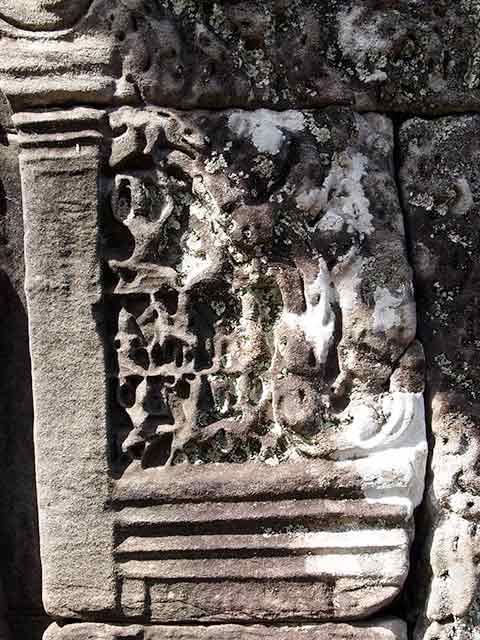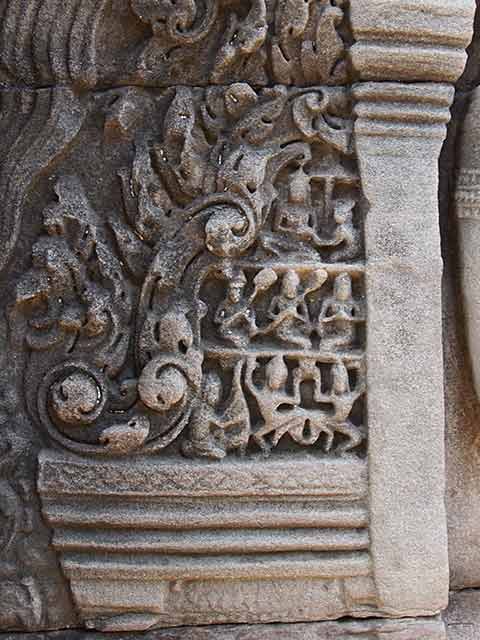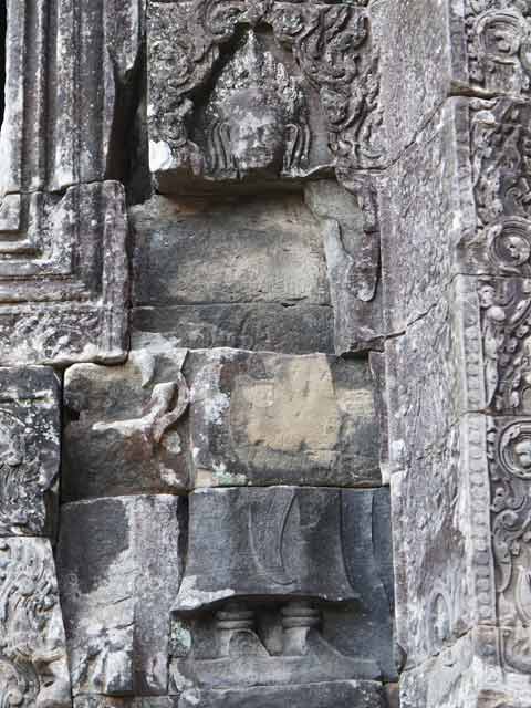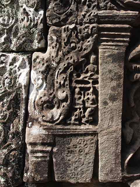 この2体が刻まれた壁がんは他と比べてとても大きくて、デヴァターの表情も豊かでした。そして、従者(供養者)や説話場面も刻まれています。(2013/01/03)