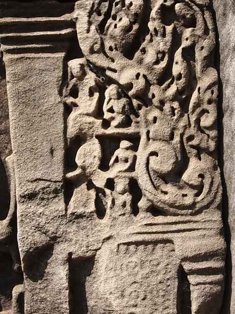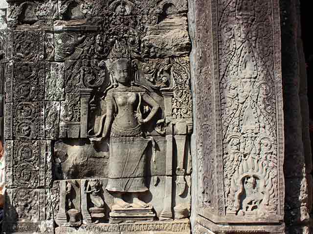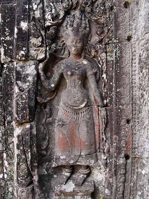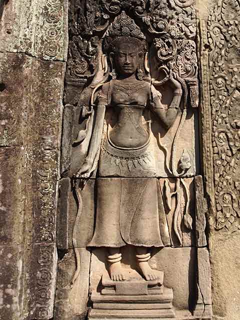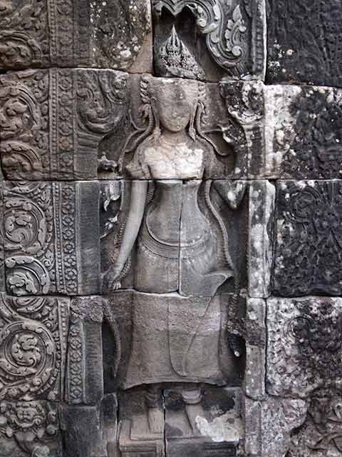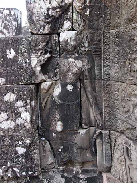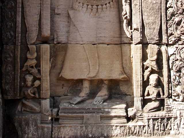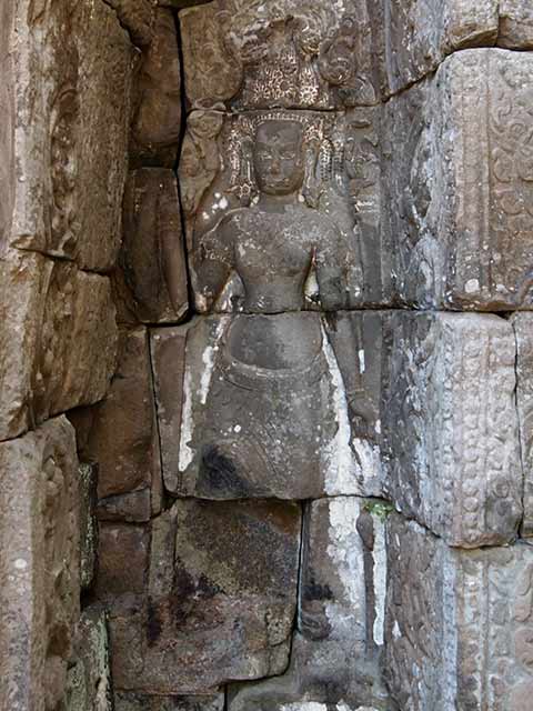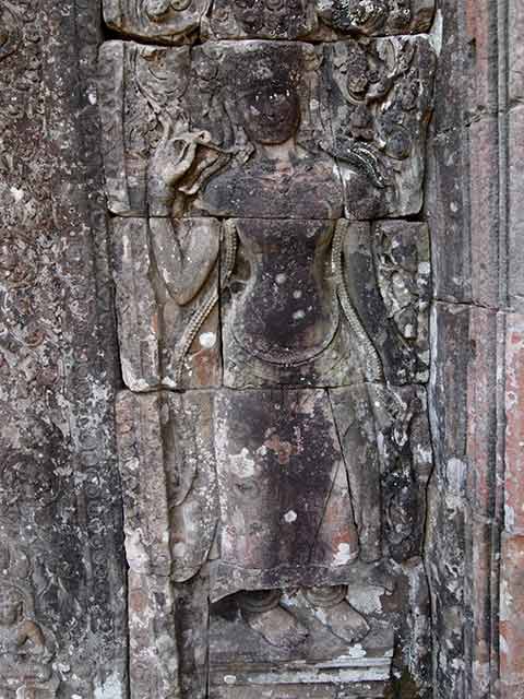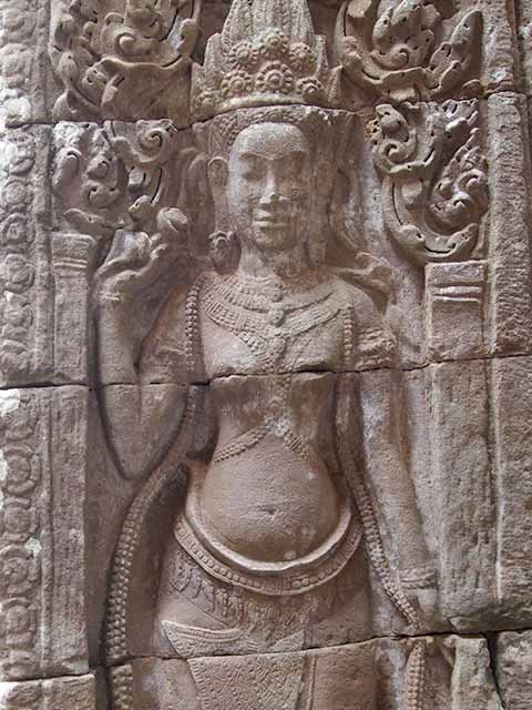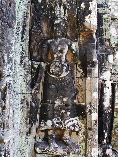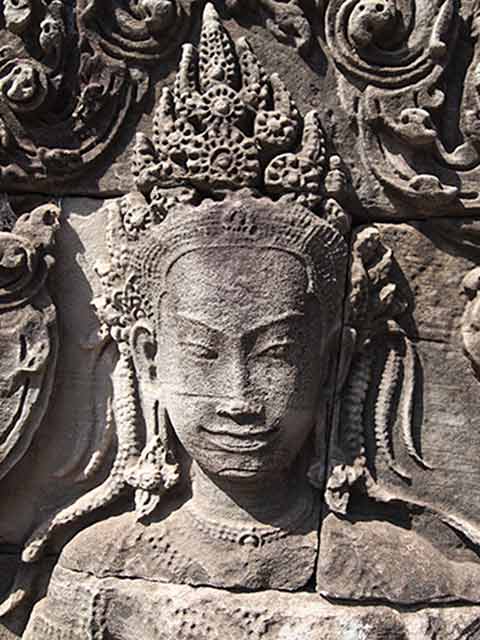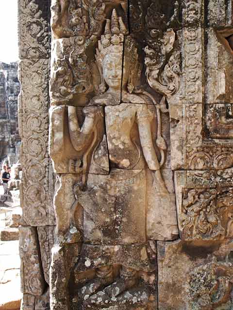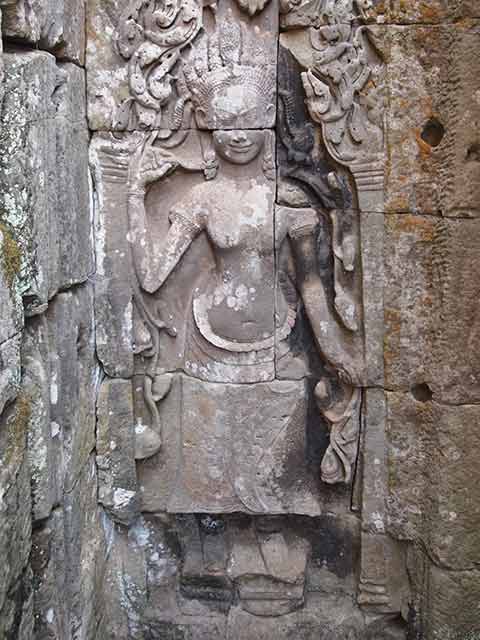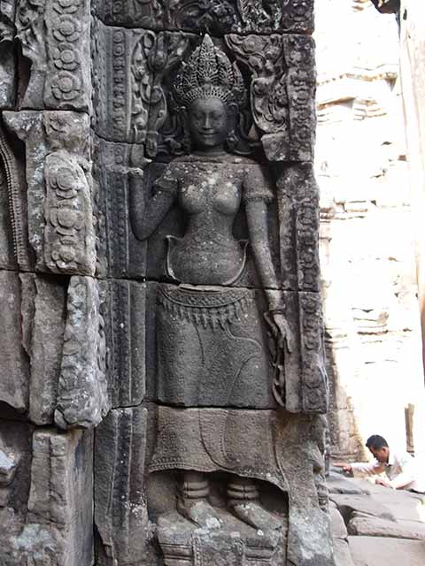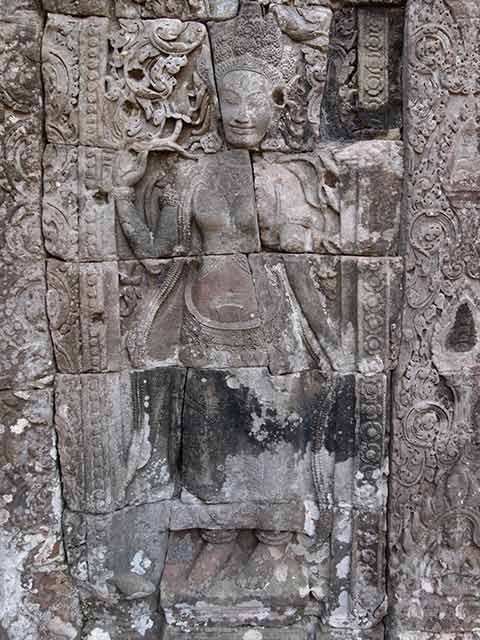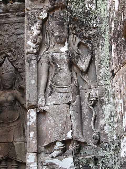 向かって左側が最初の妃で、若くして亡くなったジャヤラージャデーヴィーであり、向かって右側が2番目の妃で、ジャヤラージャデーヴィーの姉(?)にあたり、哲学や宗教にも通じ、ジャヤヴァルマンⅦ世の精神的な支えともなったインドラデーヴィーであろう。」