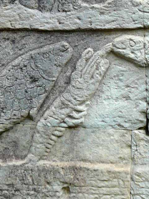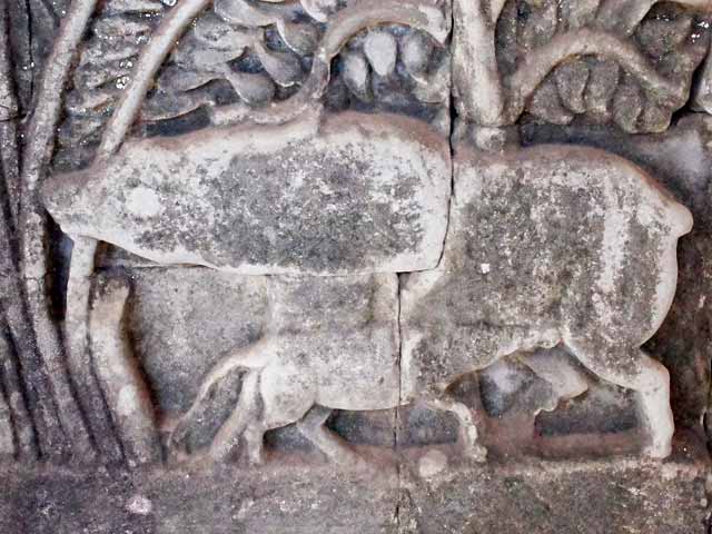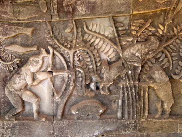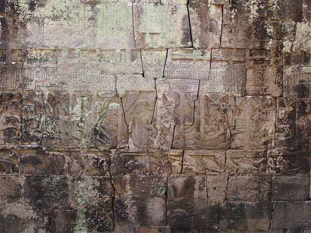 壁面は、ほぼ3段に区切られて、上段が遠景、中段が中景、下段に近景が彫刻されています。