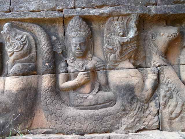 壁面は、多数の段に分かれていて、上から下までぎっしりとヤクシャや従者、デヴァター、ナーガ、象、亀やカニなどが刻まれています。