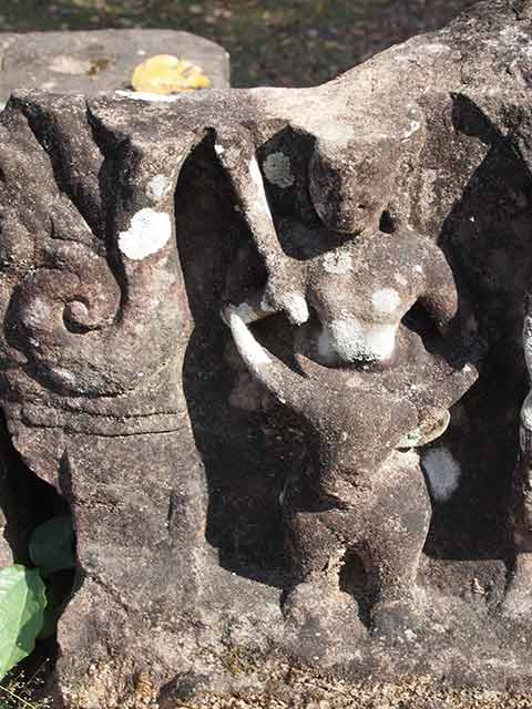 牛に乗って戟を持つ神のレリーフ(ヤマ)が、何故か、境内の地面に置かれています。