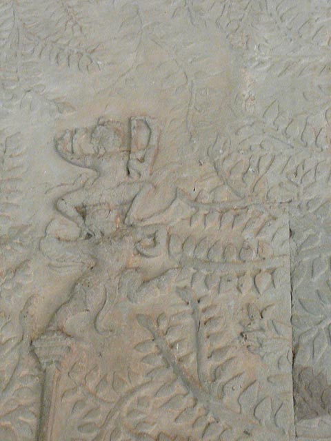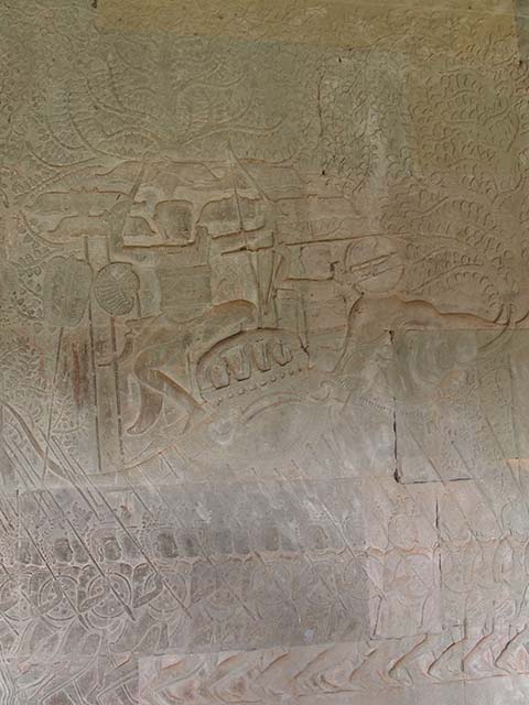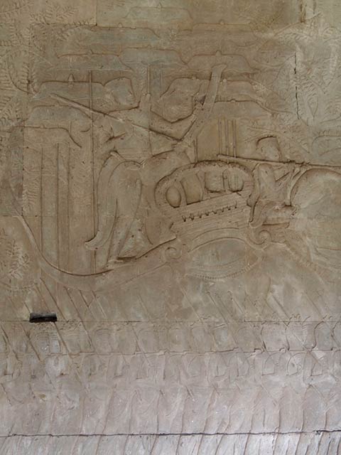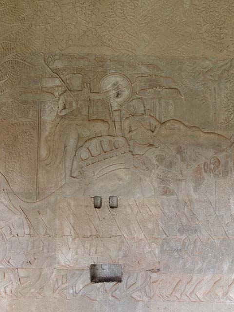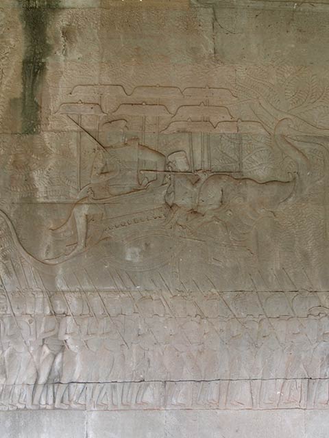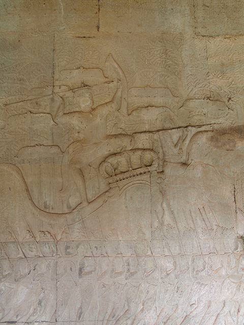 もう一つは、行進の12番目、象の上に立つ姿が、大きく描かれています。王の前方には、ガルーダに乗るビシュヌが彫られています。(2013/05/31)