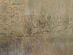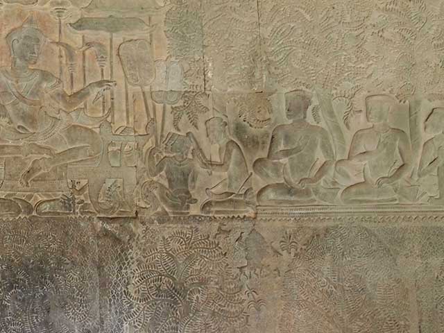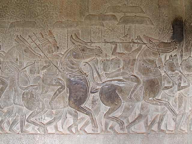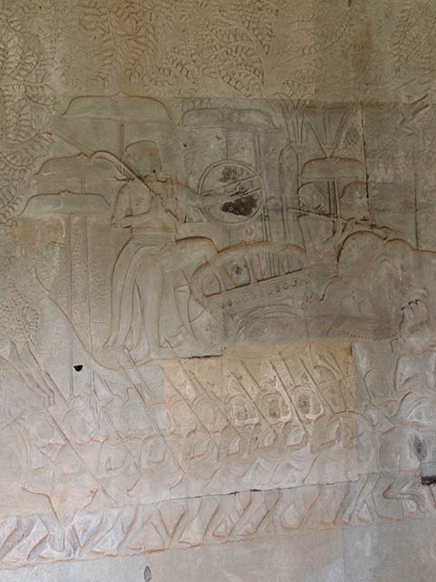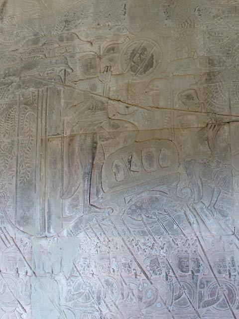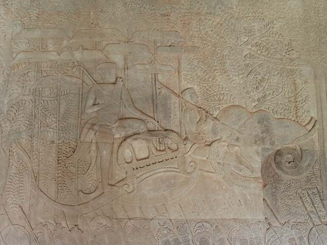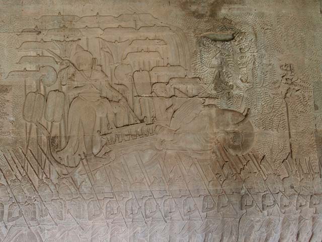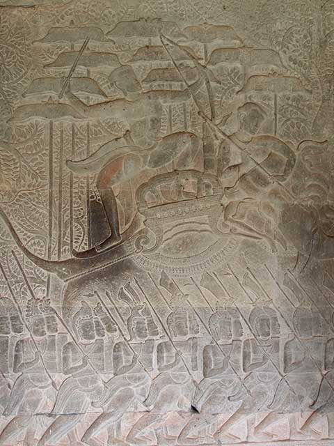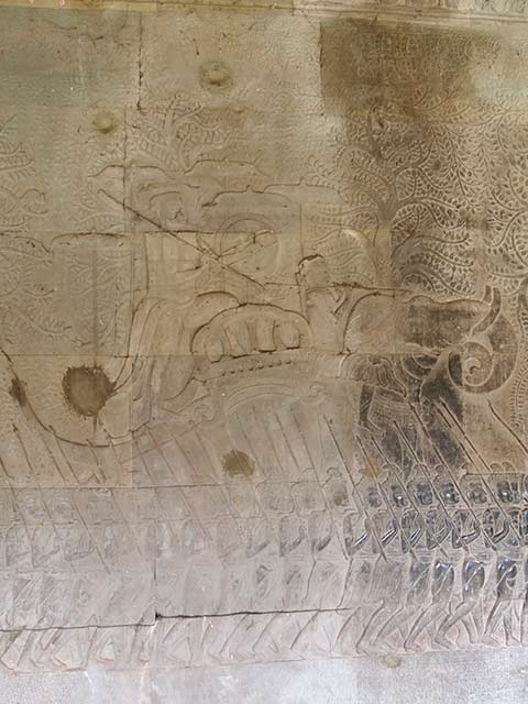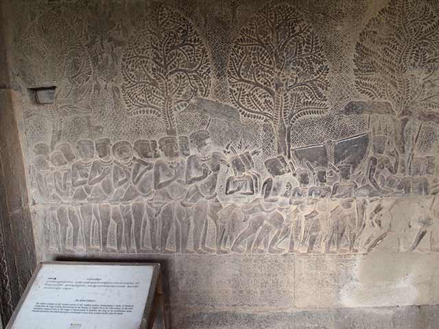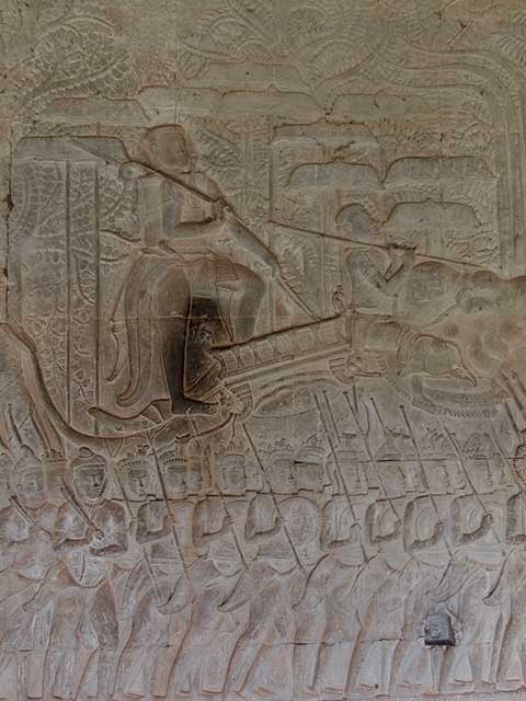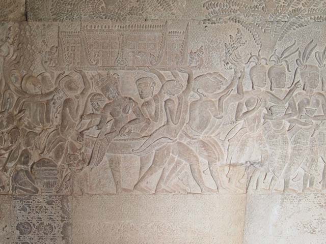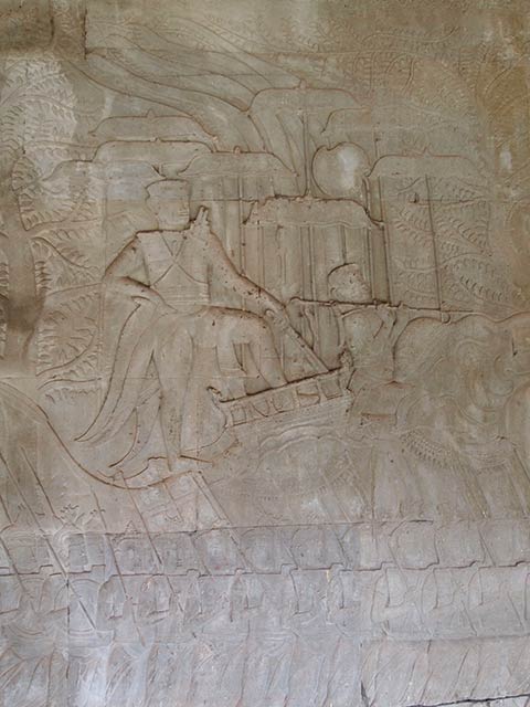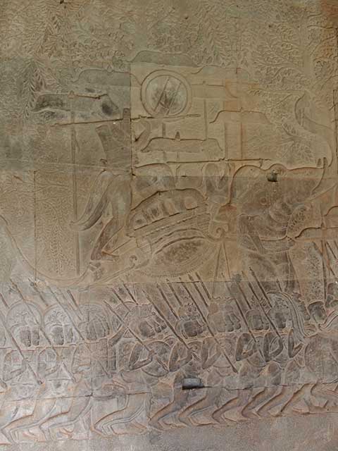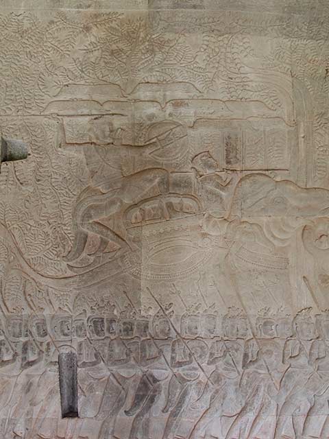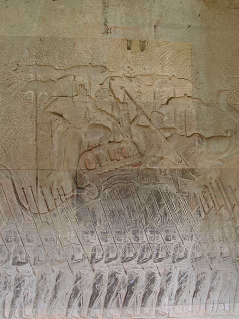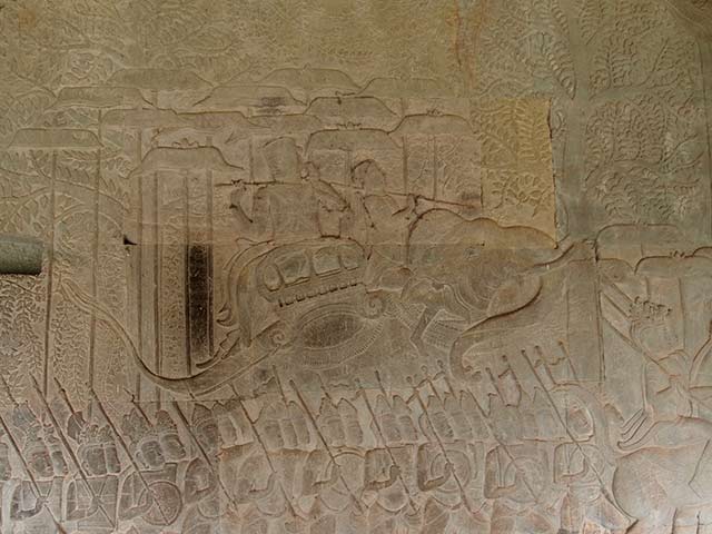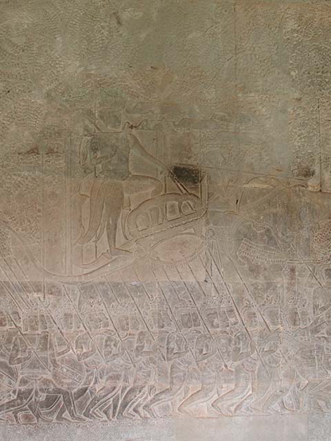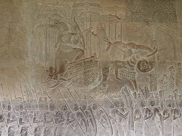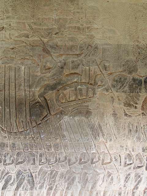 横幅93.6mの大壁画に、スールヤヴァルマン二世と19人の侍臣が、西側から東側に向かって象に乗り行進する姿で描かれています。