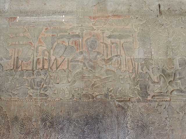 スールヤヴァルマン二世は、2箇所に描かれています。一つは、壁画の西端に、聖山シヴァパルヴァタにおいて玉座に座る姿で刻まれています。