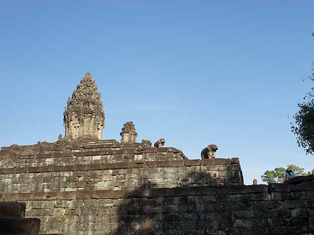 砂岩の五段の基壇を積み上げた国家鎮護寺院バコンは、ロリュオス都城の中心寺院としてインドラヴァルマン1世によって881年に建てられました。