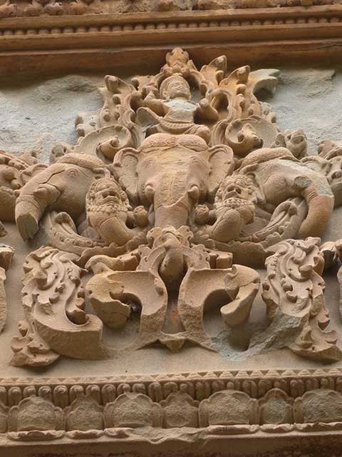 東面リンテルの中央には、アイラーヴァタに乗るインドラが彫られています。