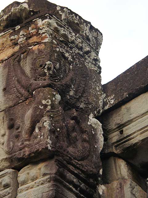 塔門脇の彫像は、アンコール・トムではアイラヴァータですが、ここは、ガルーダです。