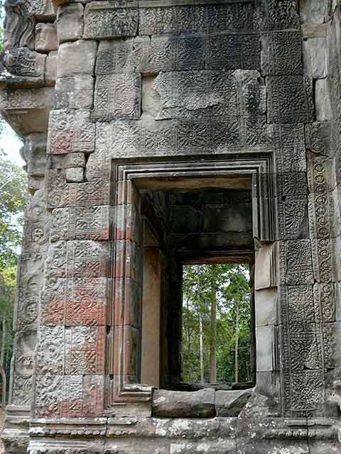 修復のため補てんされた砂岩が白く浮き上がっています。新たに組み込まれた石には彫刻も施されています。