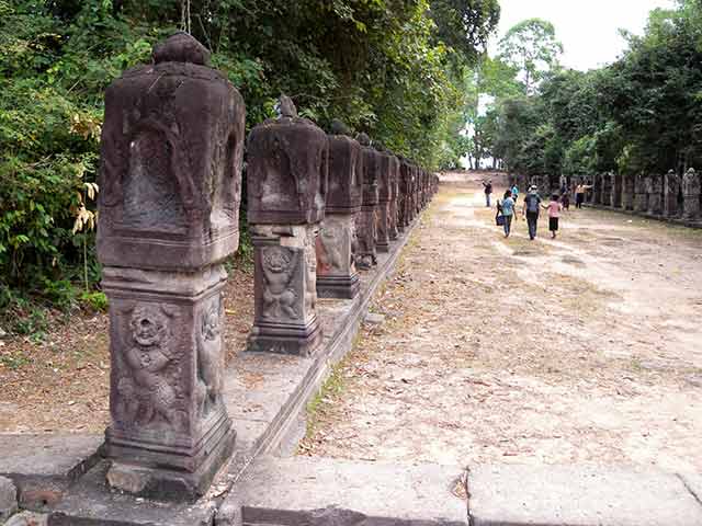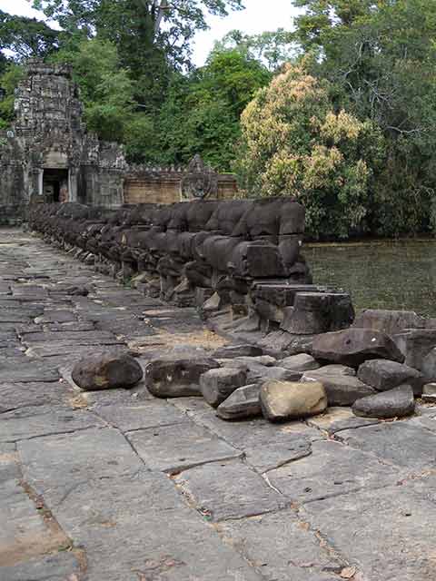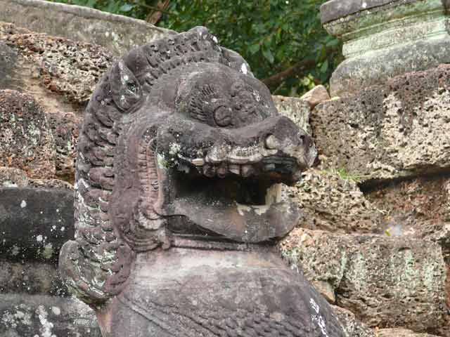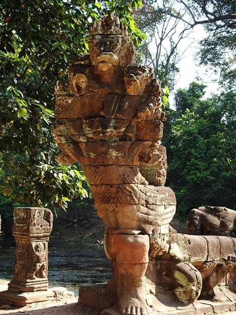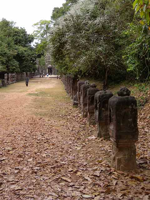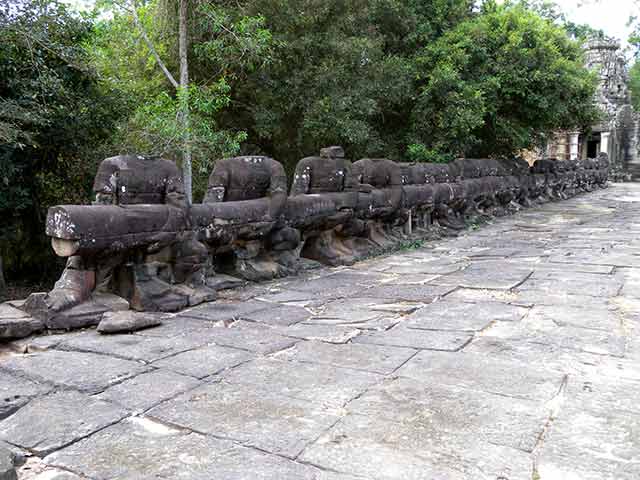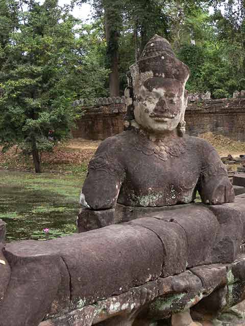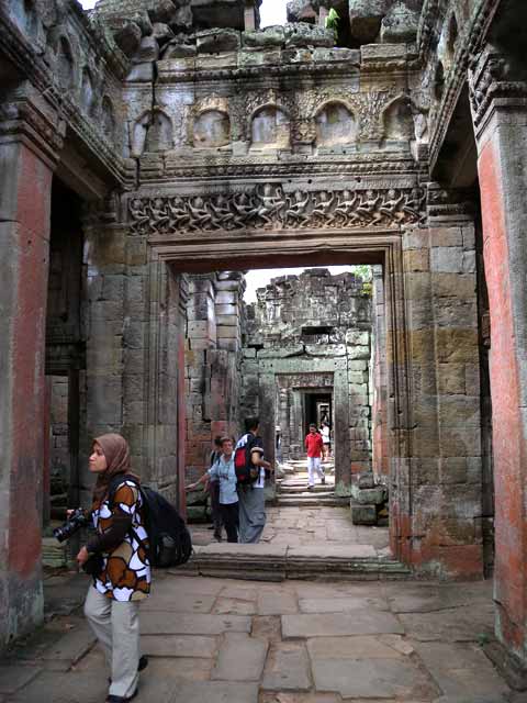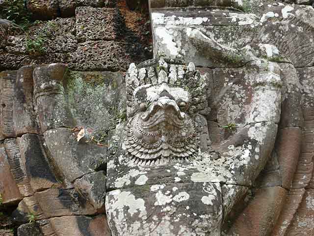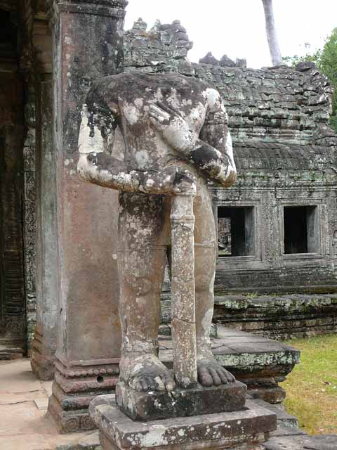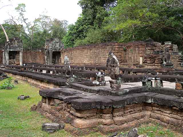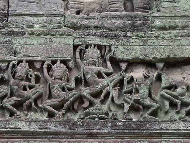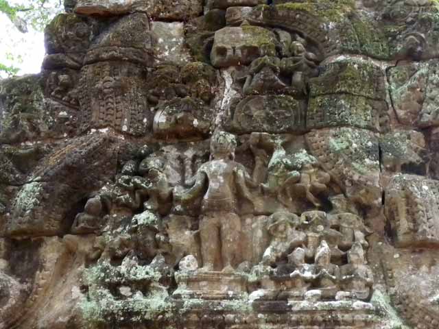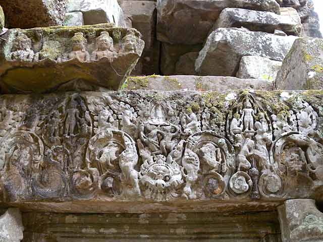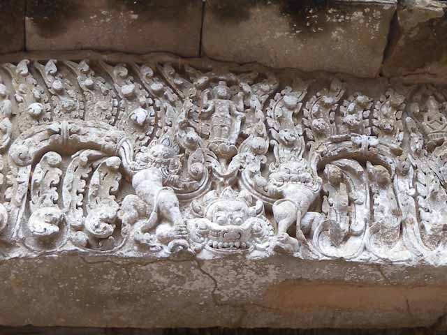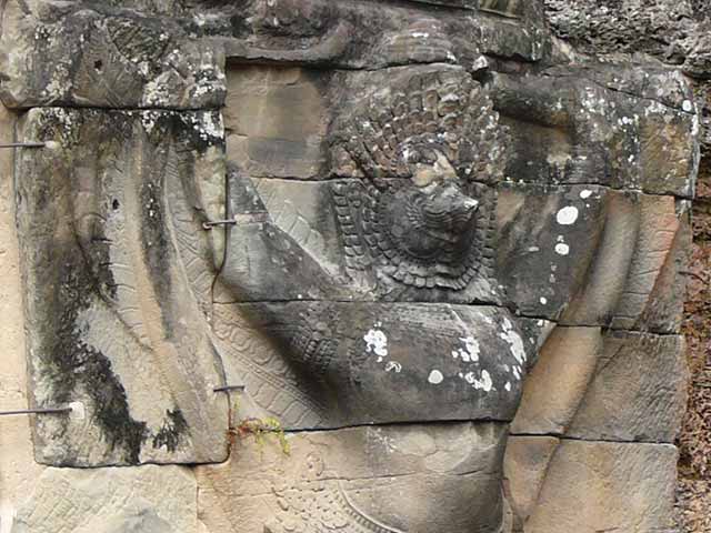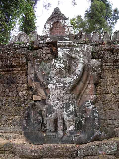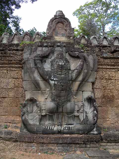 周壁にはヒンドゥー教の神鳥ガルーダの上に坐仏が彫られていましたが、ジャヤヴァルマン7世の死後、宗教的確執のため仏教の象徴である坐仏は削りとられています。