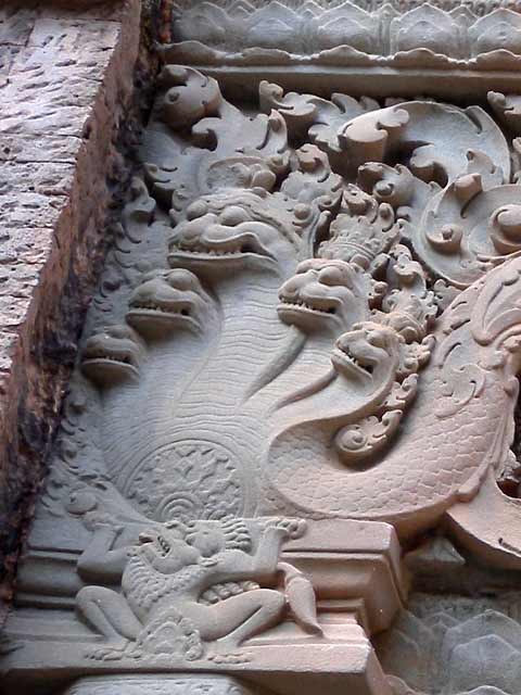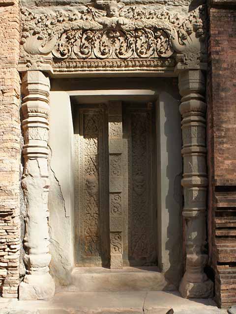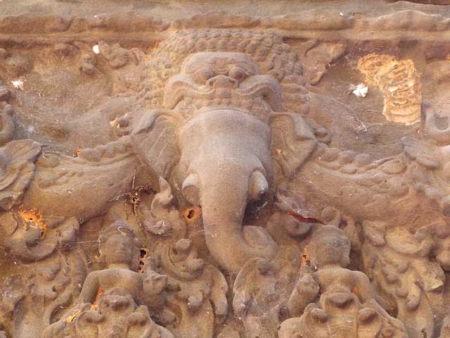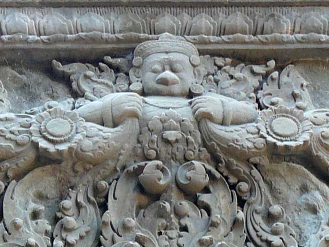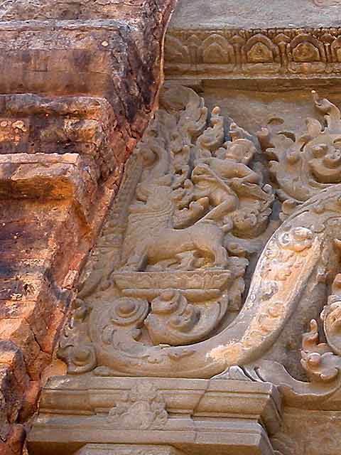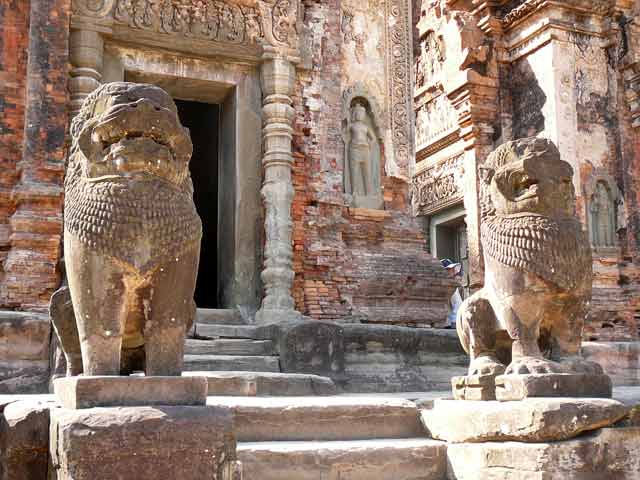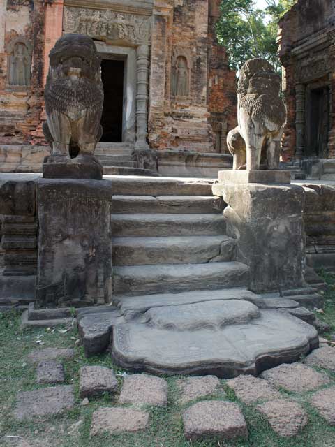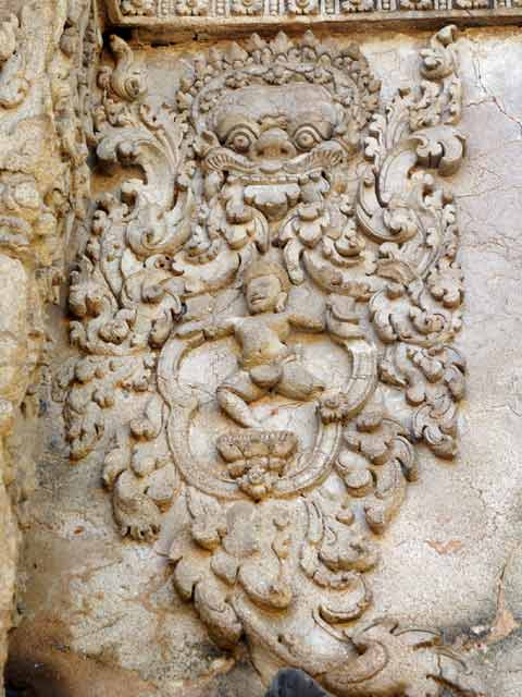 祠堂の階段脇には一対づつのシンハが置かれています。前列の祠堂両脇の壁がんには、ドヴァラパーラが、後列にはデヴァターが刻まれています。