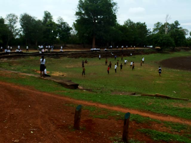 修復中の池は水が抜かれ、子供たちの恰好の遊び場になっていました。