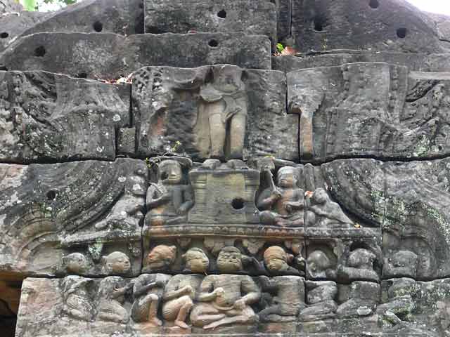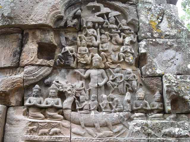 王子シッダールタの大出発や供物を受けるブッタなど、ジャータカを題材とした破風を見ることができます。