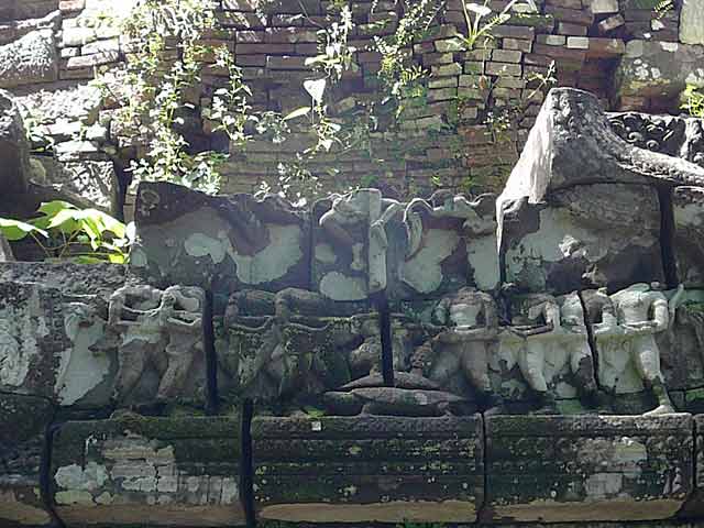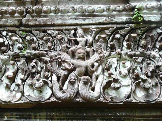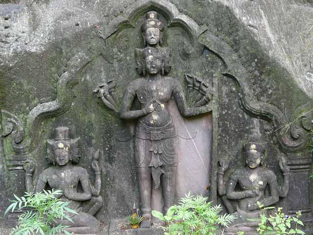 中央祠堂の向かって右側の奥に、ナーガに縁取られたトリムールティが、自然石に直接刻まれています。